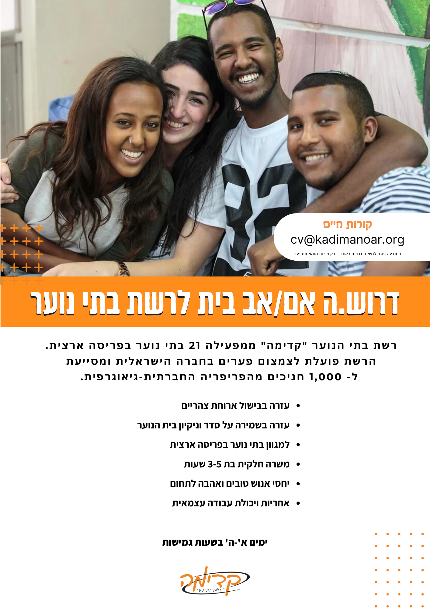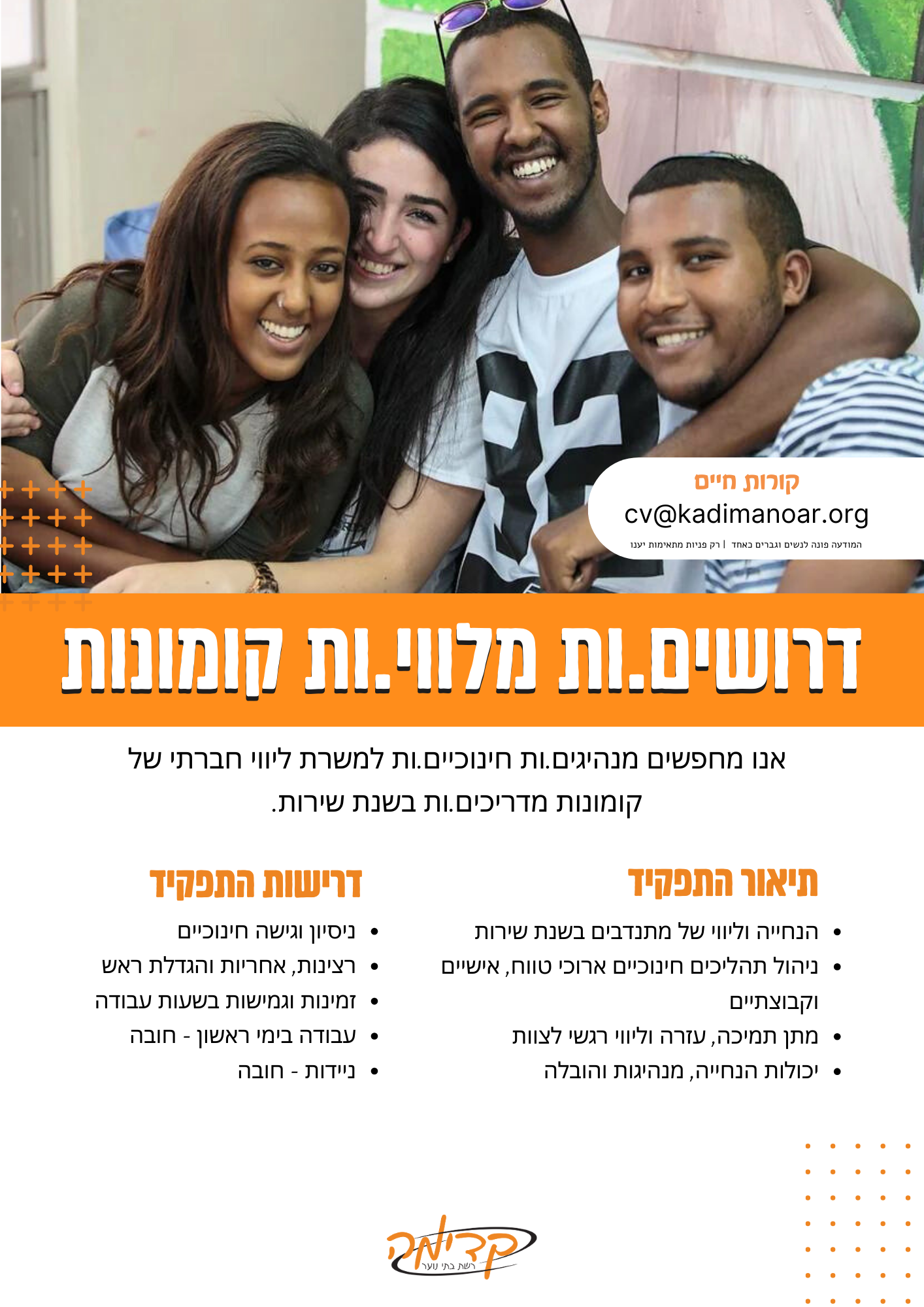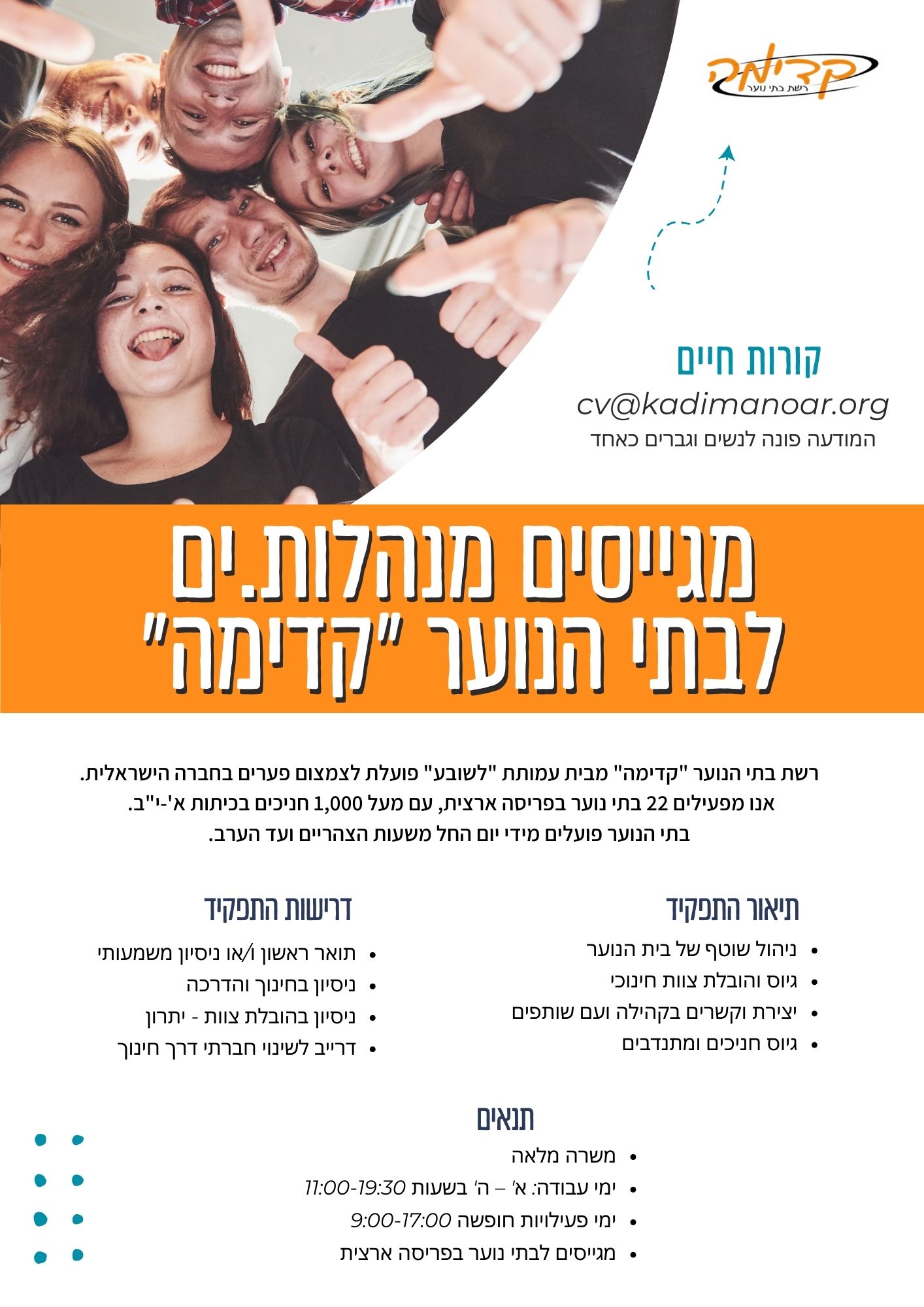 מוזמנ.ת למלא טופס מועמדות באתר לשובע (העמותה המפעילה את רשת בתי הנוער קדימה) https://bit.ly/3IIXYzo או לשלוח קו״ח למייל cv@kadimanoar.org